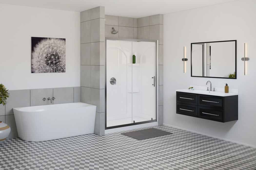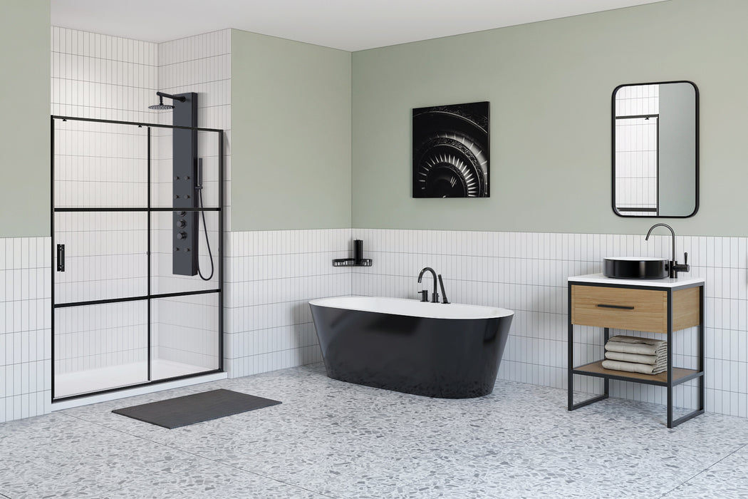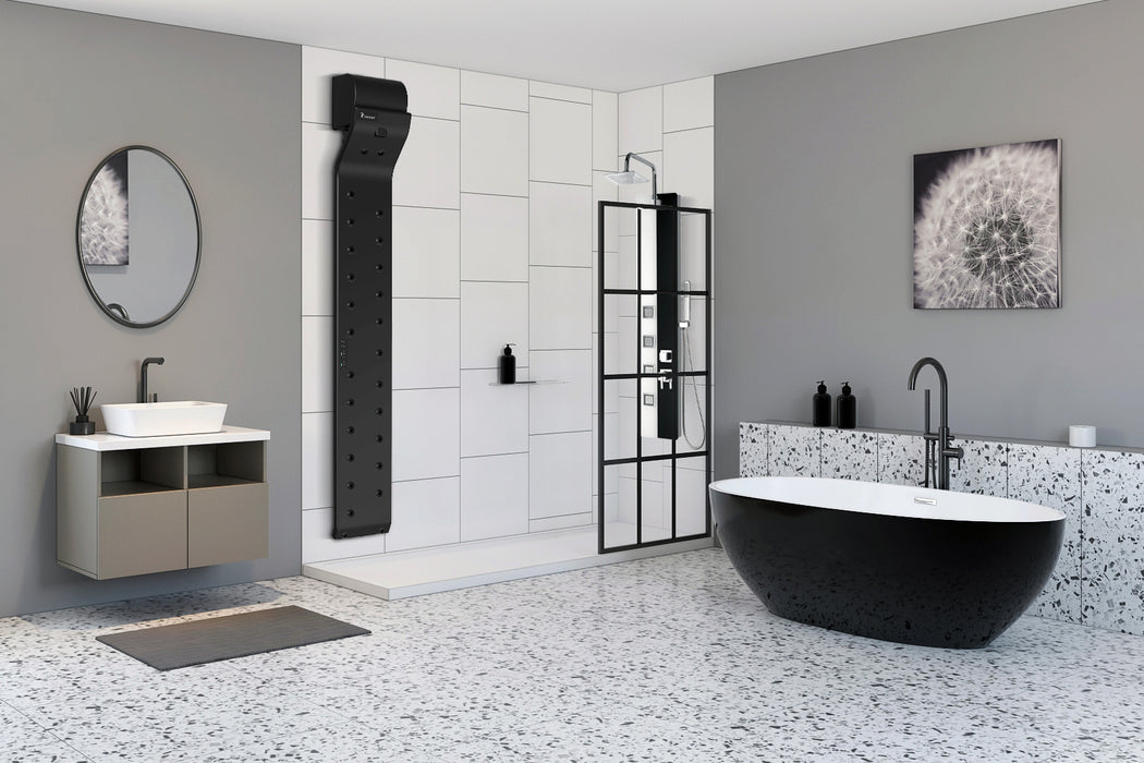 Makea statement with the black and white tones of the prestigious bathtub. The shapestands out among its peers. Under the generous flow of the two-toned shower panel,you can rinse with style in the 60" windowpane walk-in shower and dry-offin the innovative all balck body dryer. Be reminded what greatness looks likewith the addition of the slick oval black frame mirror and black and white art.