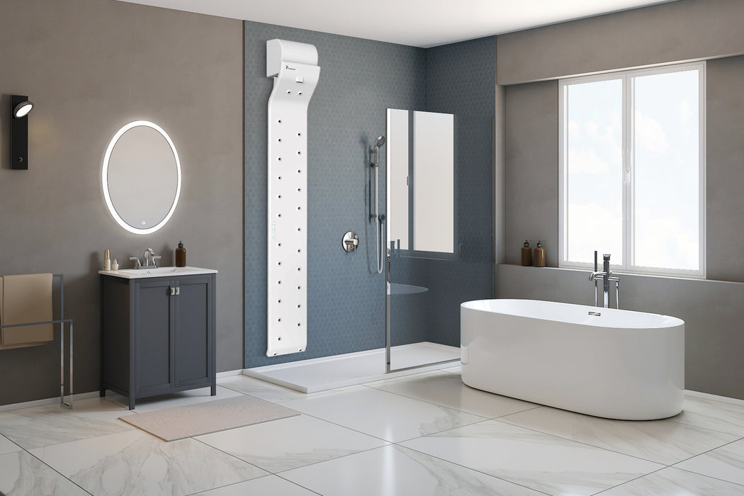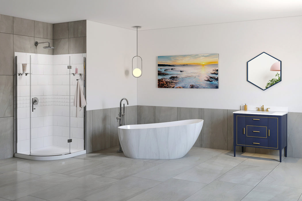 Awardyourself with a soothing bath in the delightful marble finished acrylic bathtub.It is designed to have an ergonomic back rest and a 15" soaking depth. Thetub is coupled with the frameless neo-round shower with an easy to installacrylic wall. Added to the Zen nature of the room is a landscape art piece ofchoice and a beautiful mirror creating a blissful atmosphere.