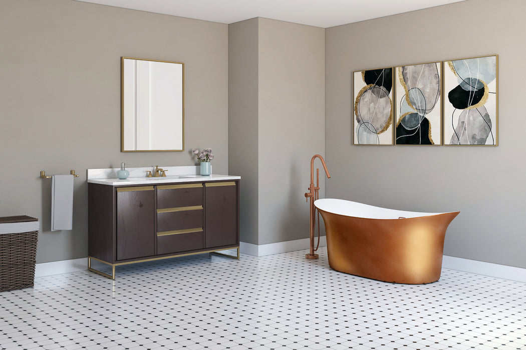Succumb toan extra touch of luxury with the gold accented room. Why not have a beautifulpiece of art as a bathtub with the painted freestanding tub and its matchingtub filler? Add to this the golden abstract art handpicked by our interiordesigners and enjoy the new favorite room in your home.